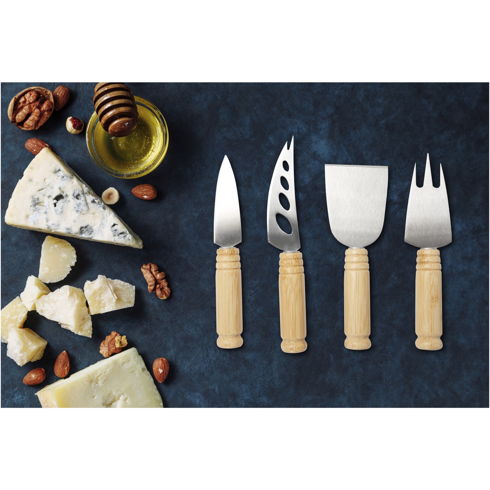Ostesæt i 4 dele fremstillet af bambus, med en paletkniv til ost (13,3 x 4,7 cm), to osteknive (13,5 x 2 cm og 15,3 x 2,5 cm), og en ostegaffel (14 x 3,5 cm). Ergonomisk designet håndtag, god størrelse og et rundt håndtag gør det nemt at holde. Håndtagene til alle redskaber er 7 cm lange med en diameter på 1,9 cm. Designet til at vikle, skære, snitte, høvle og smøre med forskellige hårde og bløde oste. De er lette og pladsbesparende, nemme at opbevare i dit køkkenskab, perfekt til festbakker eller spiseborde. Den anvendte bambus er indkøbt og produceret i overensstemmelse med bæredygtige standarder.