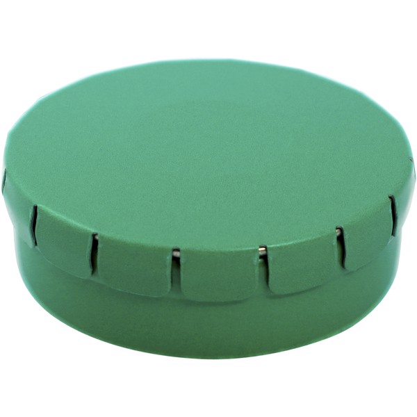 Naturlige mintpastiller i tinbeholder med let tryk-åbning. Kan bestilles i en bred vifte af farver og fyldes med forskelligt fyld: Mintpastiller, ekstra stærke mintpastiller, sukkerfri mintpastiller, frugt pastiller, hjerteformede jordbær, kanel, citron og mint pastiller eller chokolade. Kan være dekoreret med et digitaltryk i fuld farve på låget.