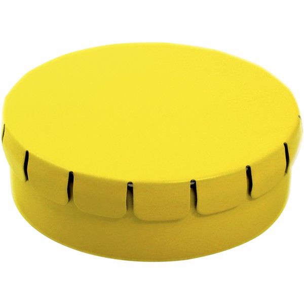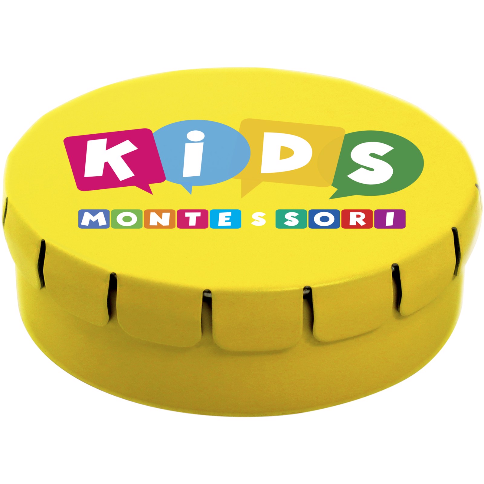 Naturlige mintpastiller i tinbeholder med let tryk-åbning. Kan bestilles i en bred vifte af farver og fyldes med forskelligt fyld: Mintpastiller, ekstra stærke mintpastiller, sukkerfri mintpastiller, frugt pastiller, hjerteformede jordbær, kanel, citron og mint pastiller eller chokolade. Kan være dekoreret med et digitaltryk i fuld farve på låget.