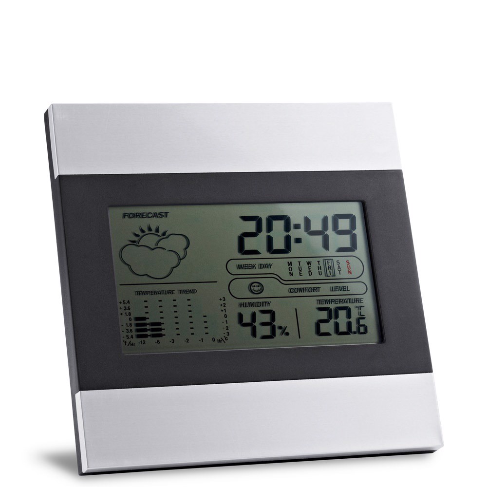 Multifunktionel vejrstation til skrivebordet med stor skærm. Nyttige oplysninger er altid tilgængelige for praktisk og intuitiv daglig styring.Materiale: ABS og aluminiumSkærm: LCDFunktioner: ur, alarm, kalender, termometer og fugtighedsmålingInkluderer: 2 AAA-batterierLevering: hvid gaveæske 130 x 130 x 19 mm