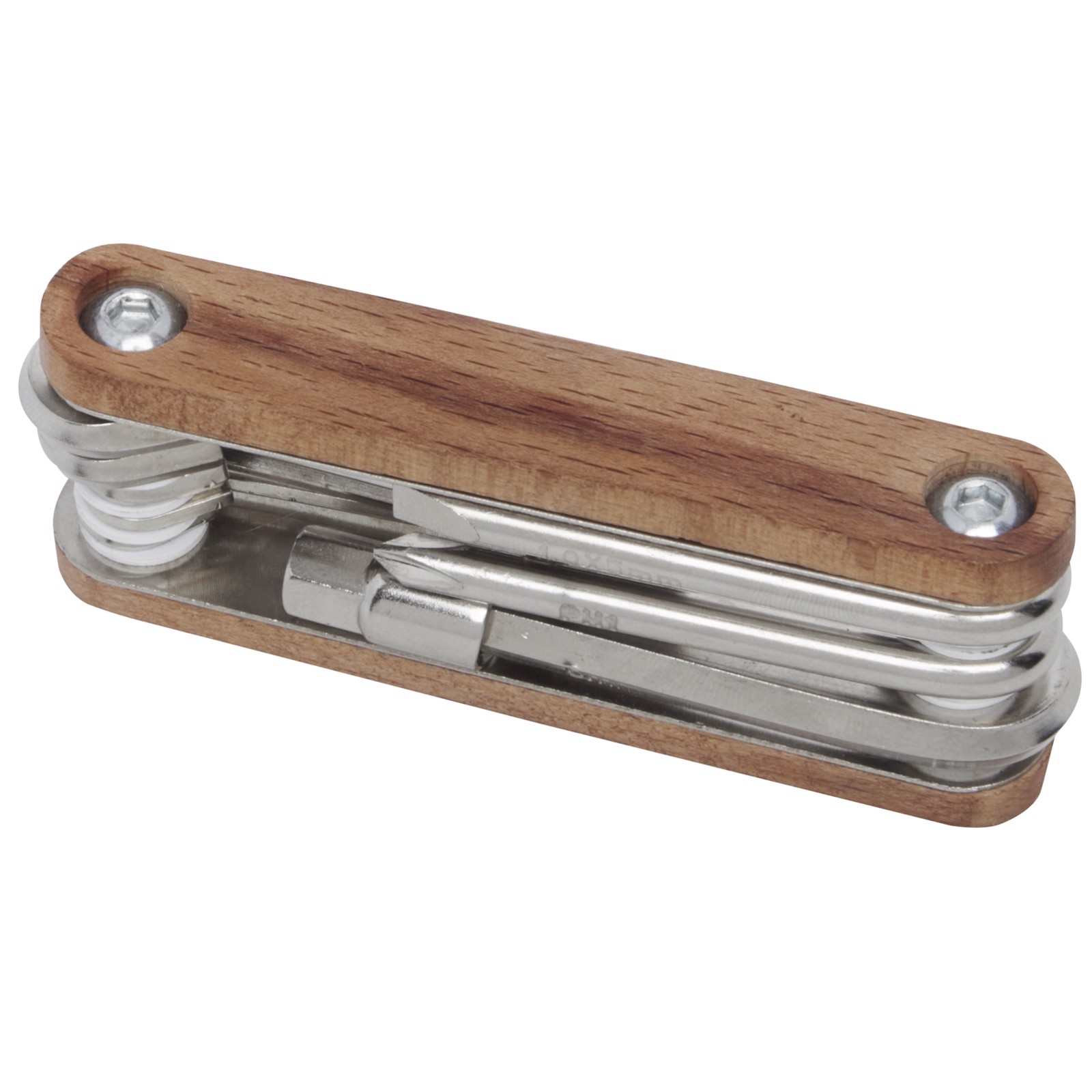 Stærkt og holdbart kompakt cykel-multiværktøj fremstillet i rustfrit stål af høj kvalitet med håndtag af bøgetræ. Dette er et must-have-værktøj for enhver cykelelsker, når der er behov for en uventet hurtig reparation. Indeholder 8 essentielle cykelværktøjer: unbrakonøgle (2 mm/2,5 mm/3 mm/4 mm/5 mm/5,5 mm/6 mm), stjerneskruetrækker og flad skruetrækker. Det anvendte bøgetræ er fra bæredygtige, miljømæssige og socialt ansvarlige kilder. Størrelsen, når den er åben, er 19,5 x 3,6 cm, og når den er lukket 9,6 x 3,6 cm. Der medfølger en brugsanvisning, og den er pakket i en gaveæske i genbrugspap med en størrelse på 12 x 4,5 x 4 cm. Lasergravering anbefales som en bæredygtig dekorationsmulighed.