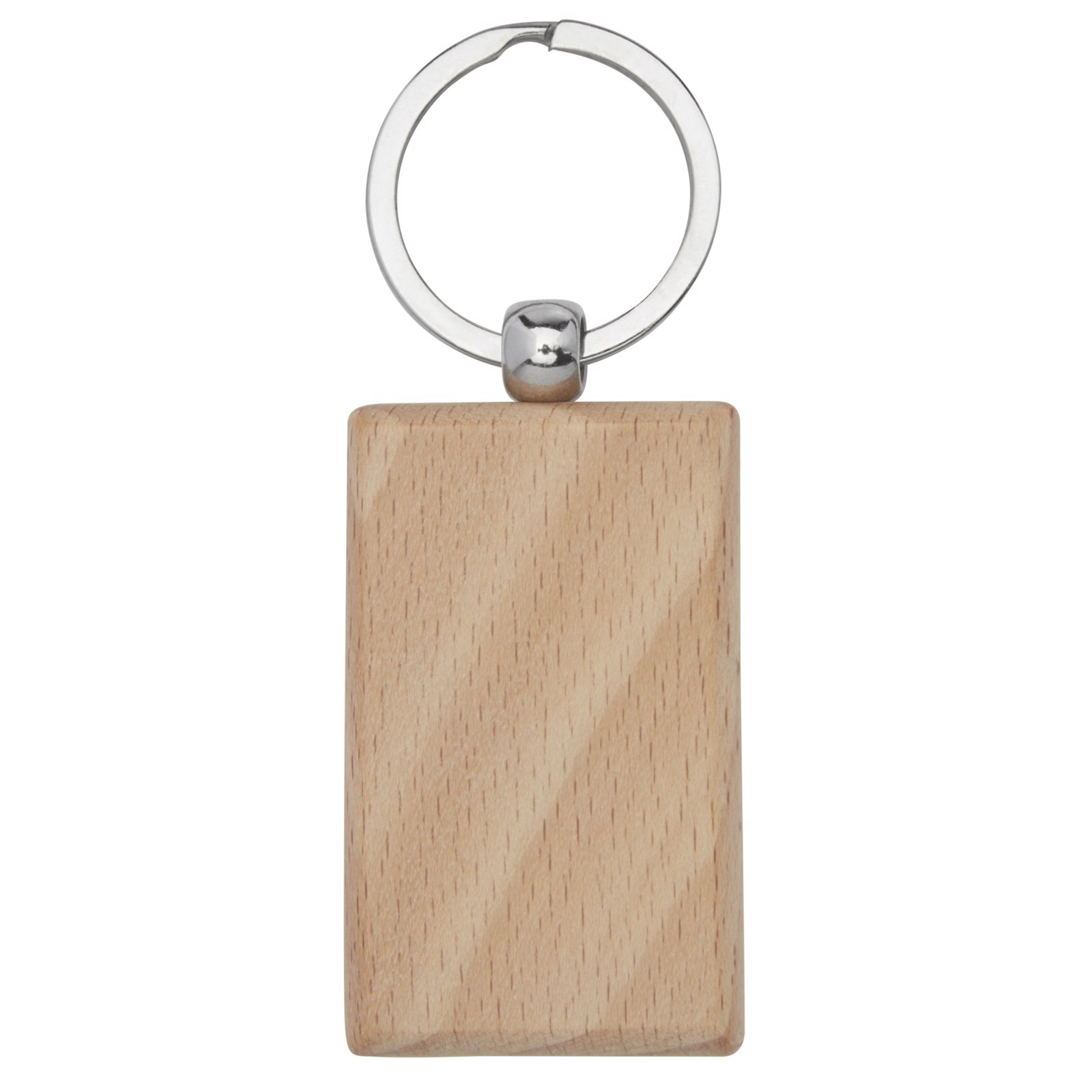Rektangulær nøglering fremstillet af bøgetræ, der leveres i en brun håndlavet papirkuvert i genvundet Kraft papir. Nøgleringens størrelse er 5,5 x 3,5 cm. Fremstillet til gravering.