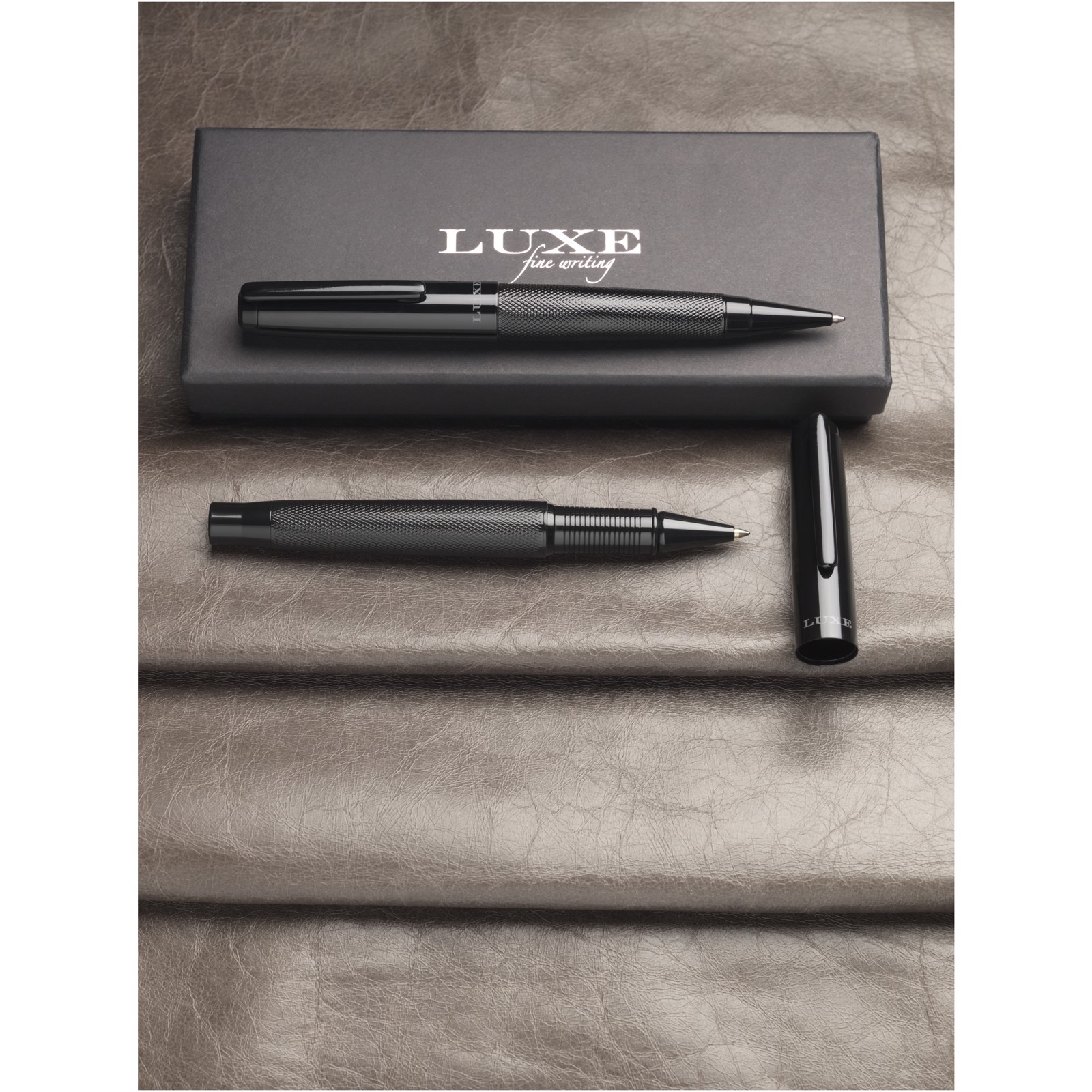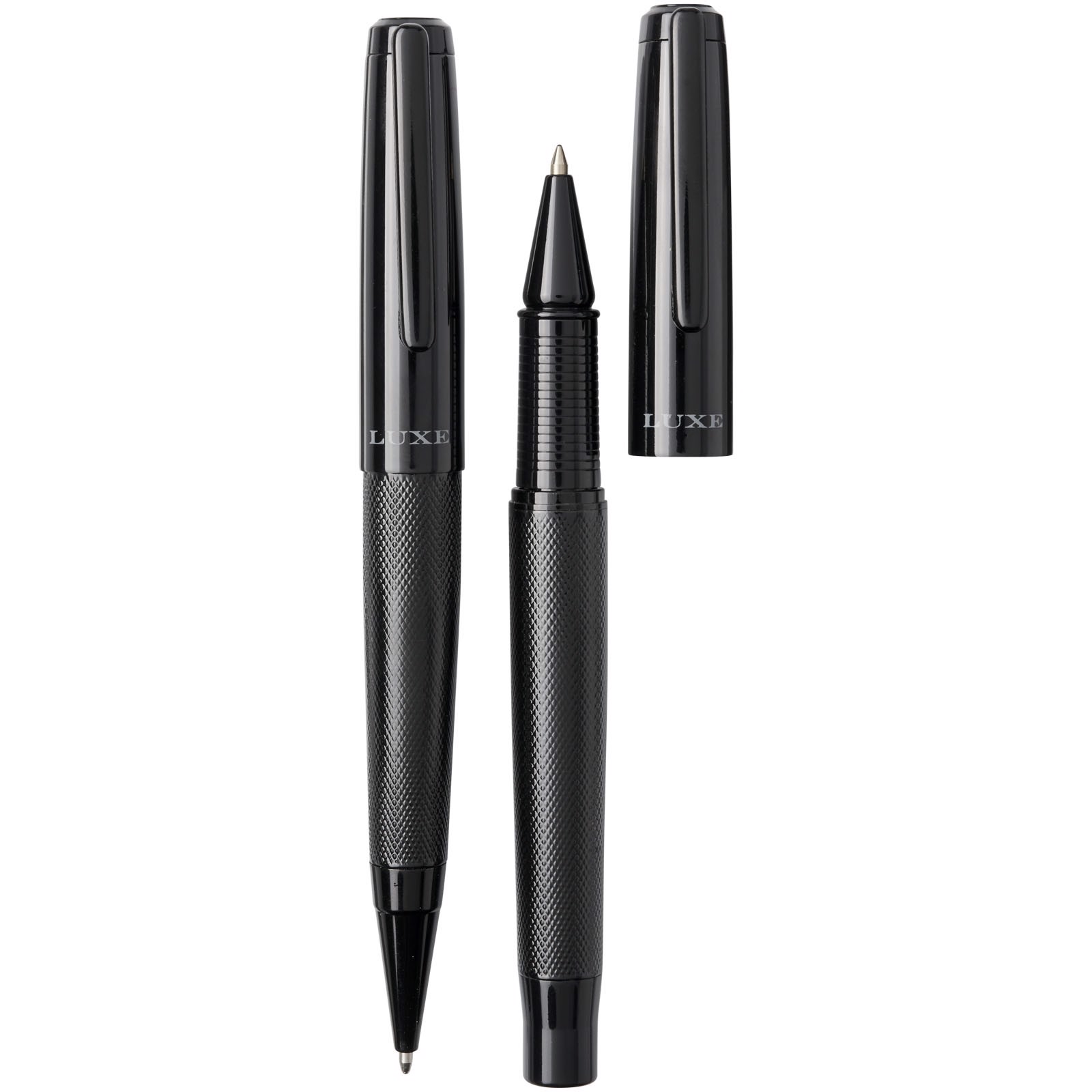 Gavesæt med kuglepen og rullepen med sort øvre og nedre cylinder med en blank finish, leveret i en luksus-gaveæske. Kuglepen: 14 cm x 1,45 cm, vægt: 40 gr, skrivelængde: 800 m. Rullepen: 13,8 cm x 1,45 cm, vægt: 54 gr, skrivelængde: 400 m.