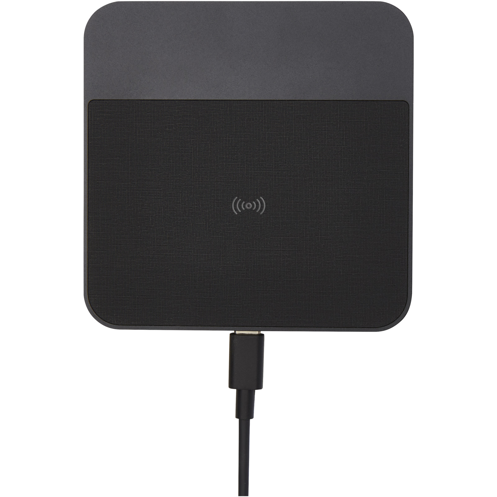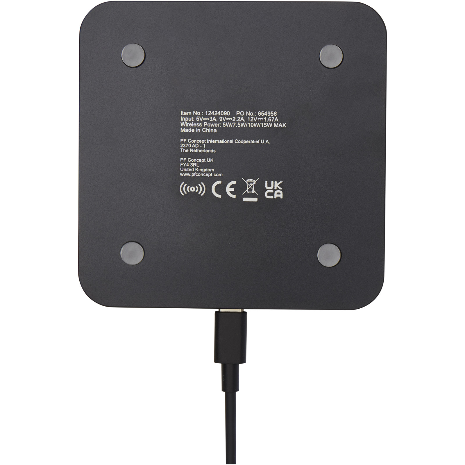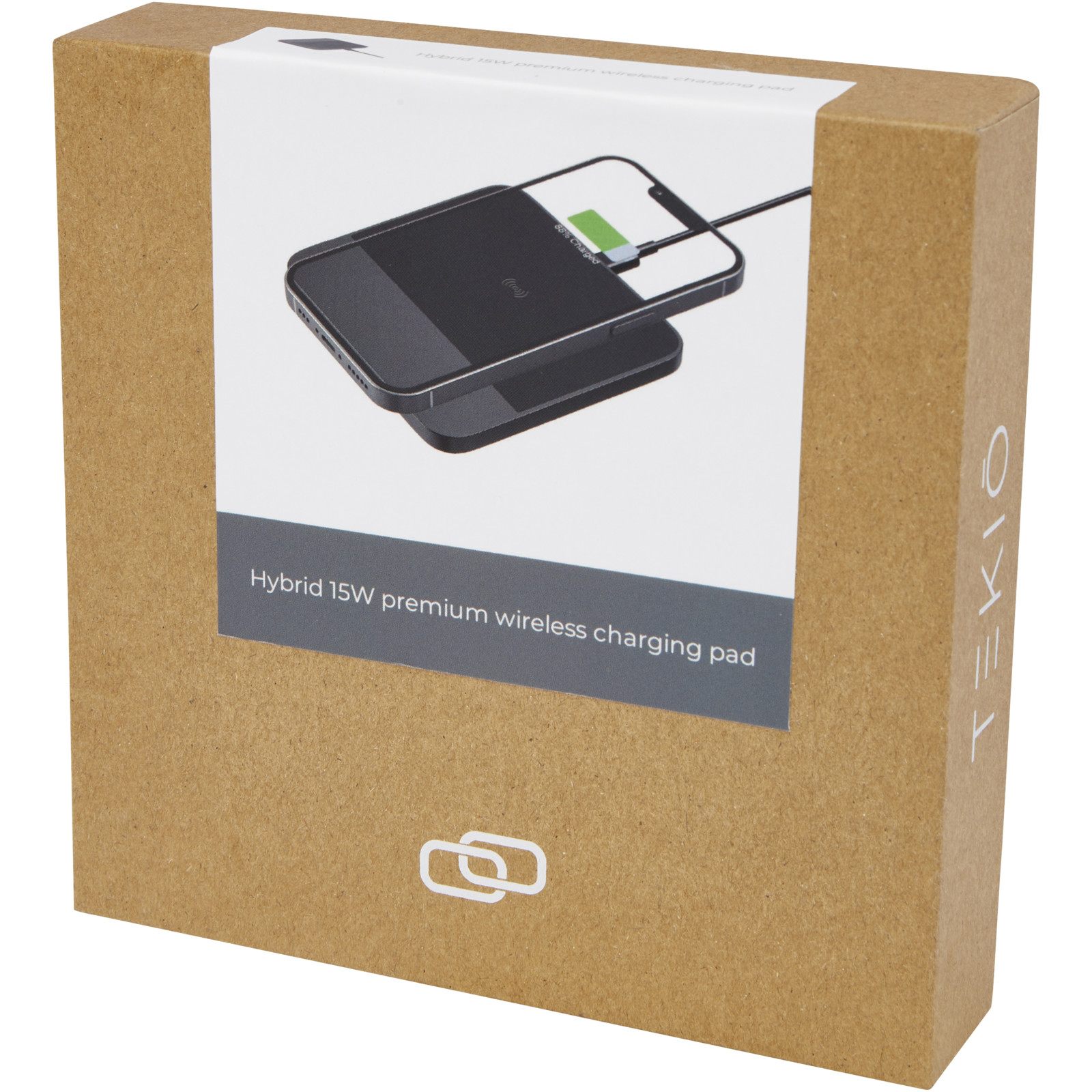 Den hybride 15 W trådløse oplader er et aktiv for ethvert skrivebord. Den kan nemt være i en laptoptaskes lommer takket være det ultra slanke design. Lavet af et slidstærkt aluminiumshus kombineret med en skridsikker TPU læderopladningspad. Med op til 15 W trådløs opladning er enheder hurtigt fuldt opladte. Kompatibel med alle Qi enheder (iPhone 8 eller nyere og Android enheder, der understøtter trådløs opladning). Har indbygget FOD (Foreign Object Detection, identifikation af fremmede objekter) til at identificere uønskede objekter og sikre en jævn opladning. Leveres i en æske af kraftpapir med et farverigt klistermærke. Type C-opladerkabel medfølger.