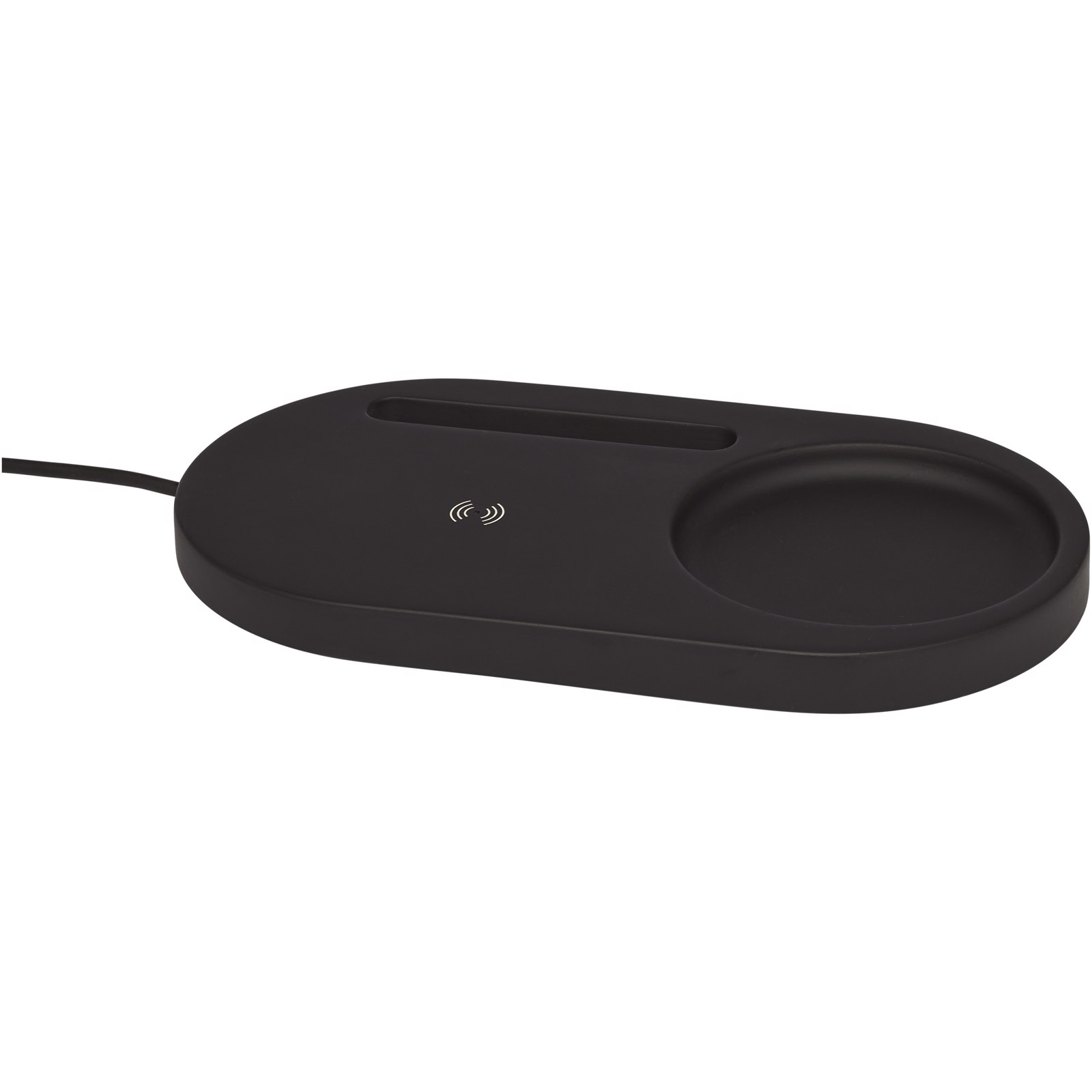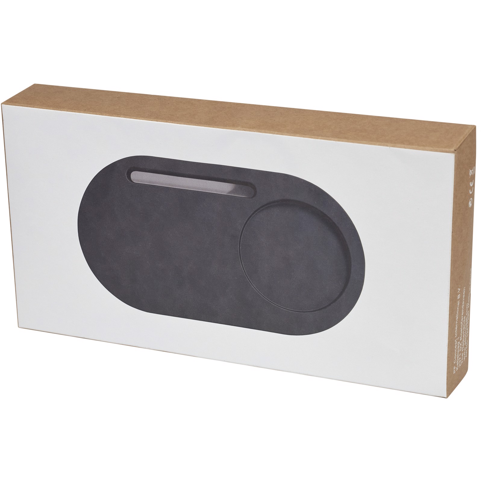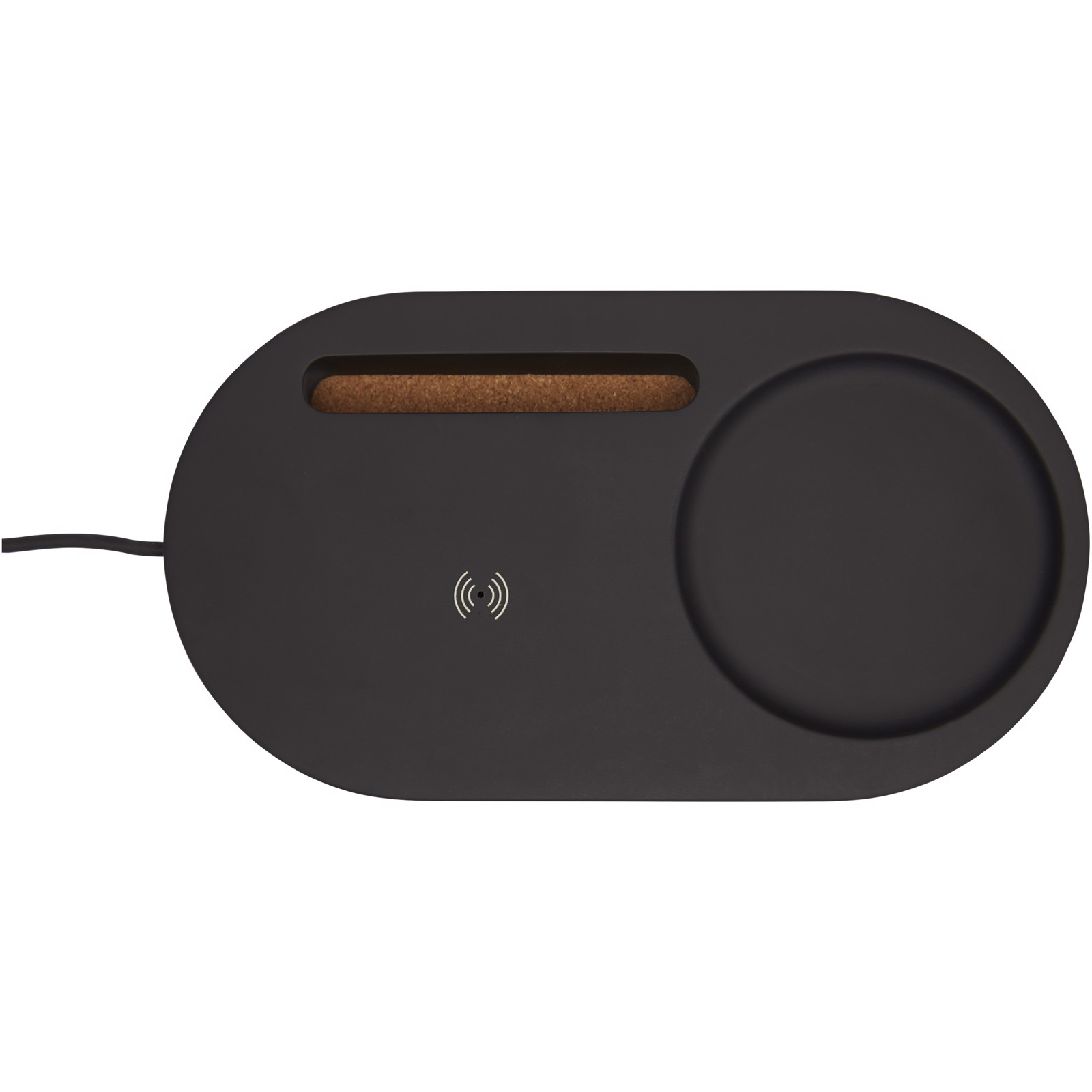 Skrivebordsbakker med 5 W trådløs oplader fremstillet af en kombination af naturlig kalksten og kork. For at oplade en enhed uden trådløs teknologi kræves en ekstern trådløs oplader eller et modtageretui. Pakket i en gaveæske og leveres med manual (begge lavet af bæredygtigt materiale). 100 cm USB-kabel medfølger.
