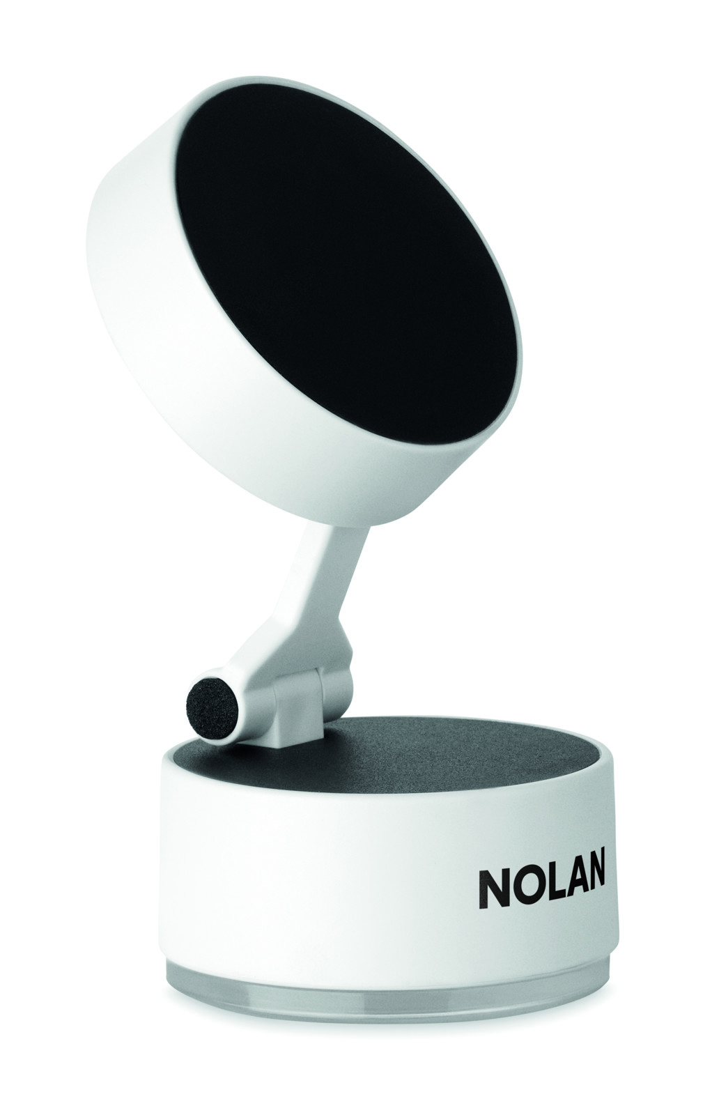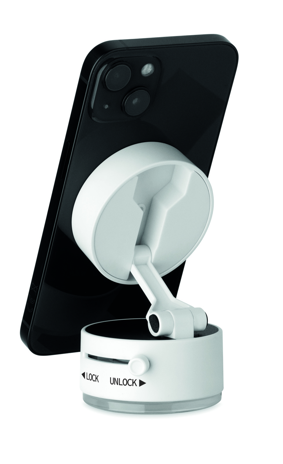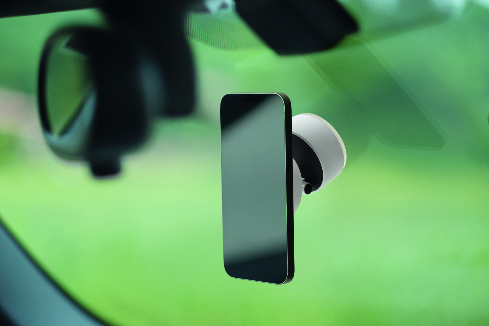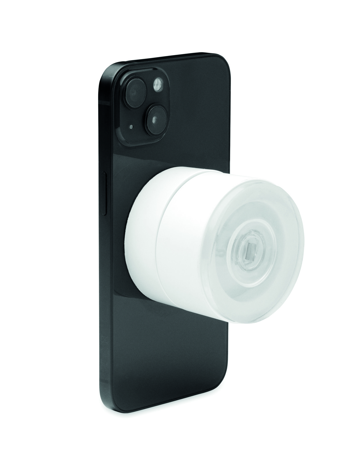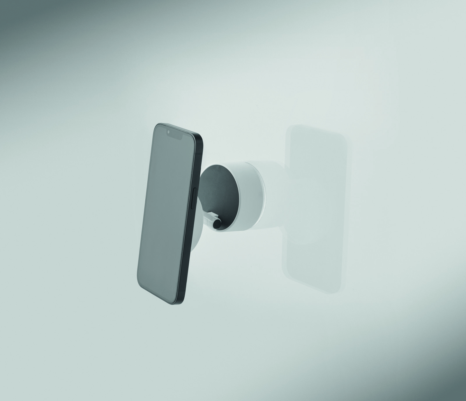 Magnetisk telefonholder i ABS. Holder med vakuumsug. Kompatibel med iPhone® 12 og nyere. Inklusive ekstra magnetisk metalring til opladning af andre ikke-magnetiske telefoner med trådløs opladning.