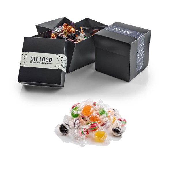 Indholdet i gaveæsken kan tilpasses jeres ønsker blandt flere populære smagsvarianter. Vælg eksempelvis et klassisk slikmix, chokoladekugler med cremet fylde eller de populære Mars Miniature Mix. Mulighederne spænder bredt og giver jer friheden til at sætte et personligt præg på oplevelsen - uanset om modtagerne er glade for chokolade, karameller eller blandede favoritter.