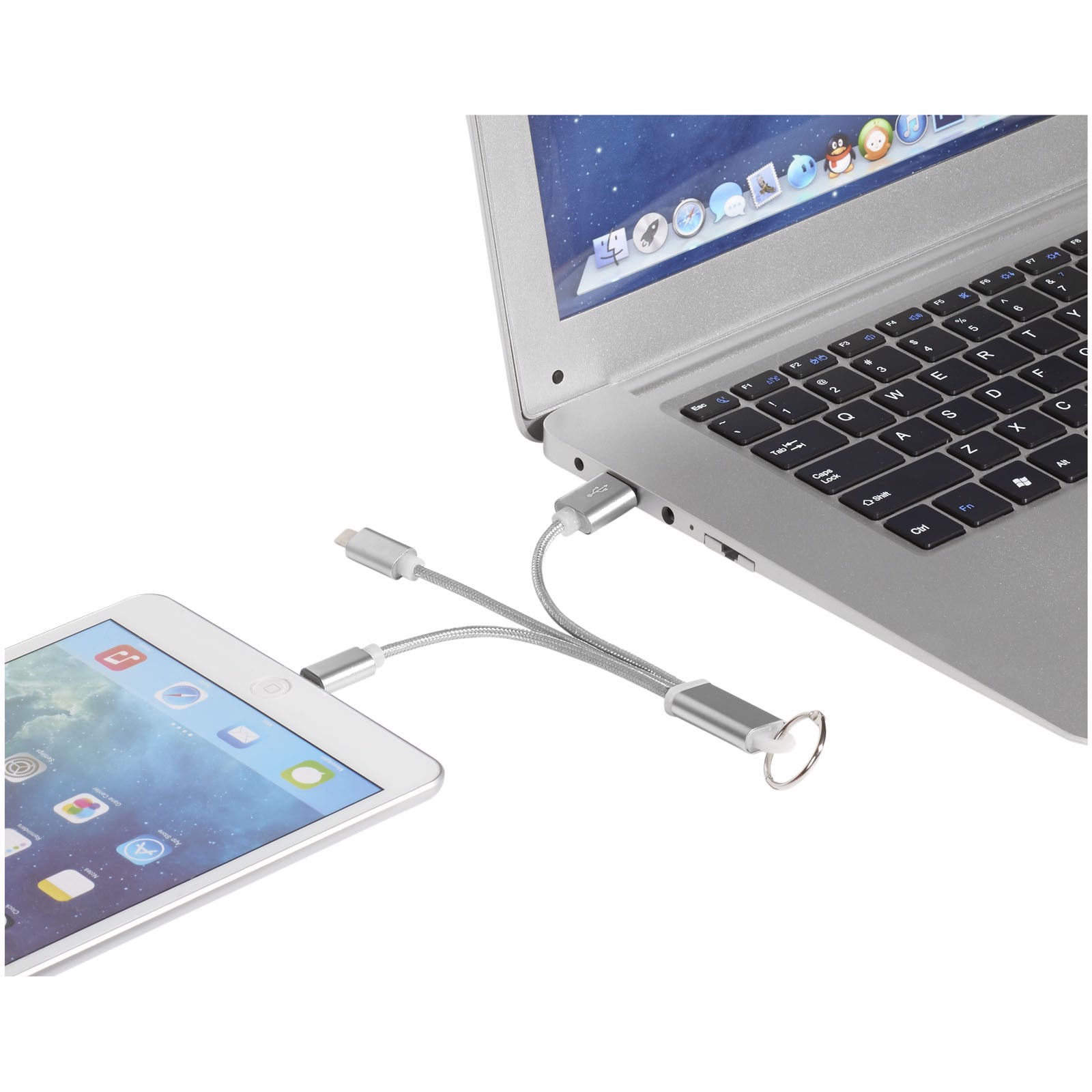 3-i-1 opladerkabel i metal med nøglering. 3-i-1 opladerkablet i metal med nøglering har en 1 type C, 1 USB type A og en 2-i-1 dobbelt-kompatibel spids til både Apple iOS- og Android-enheder. Leveres med en nøgle-kæde. Til opladning af Apple-enheder, indsæt kablet med siden uden ben i enheden og for at oplade Android-enheder, indsæt kablet med siden med ben i enheden.