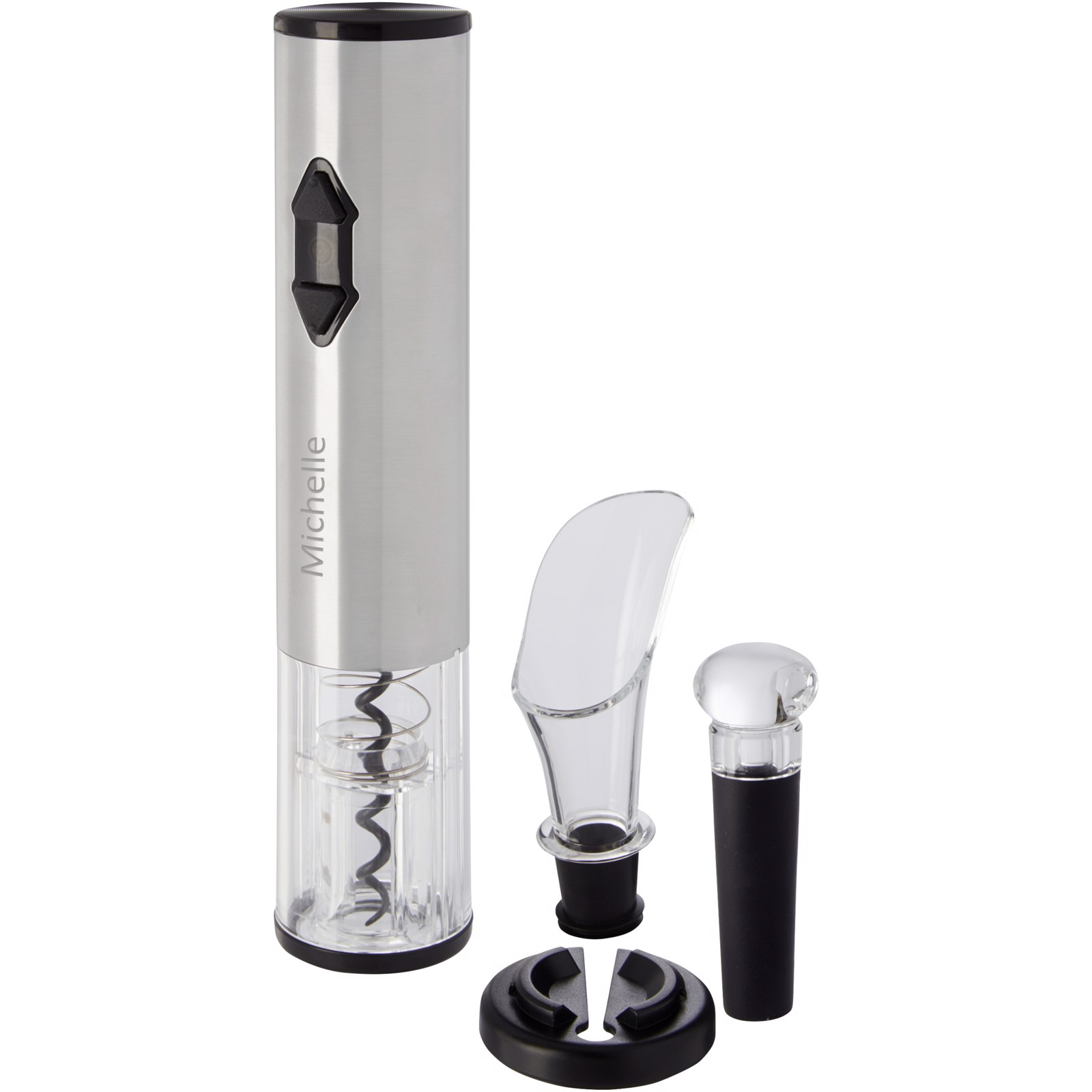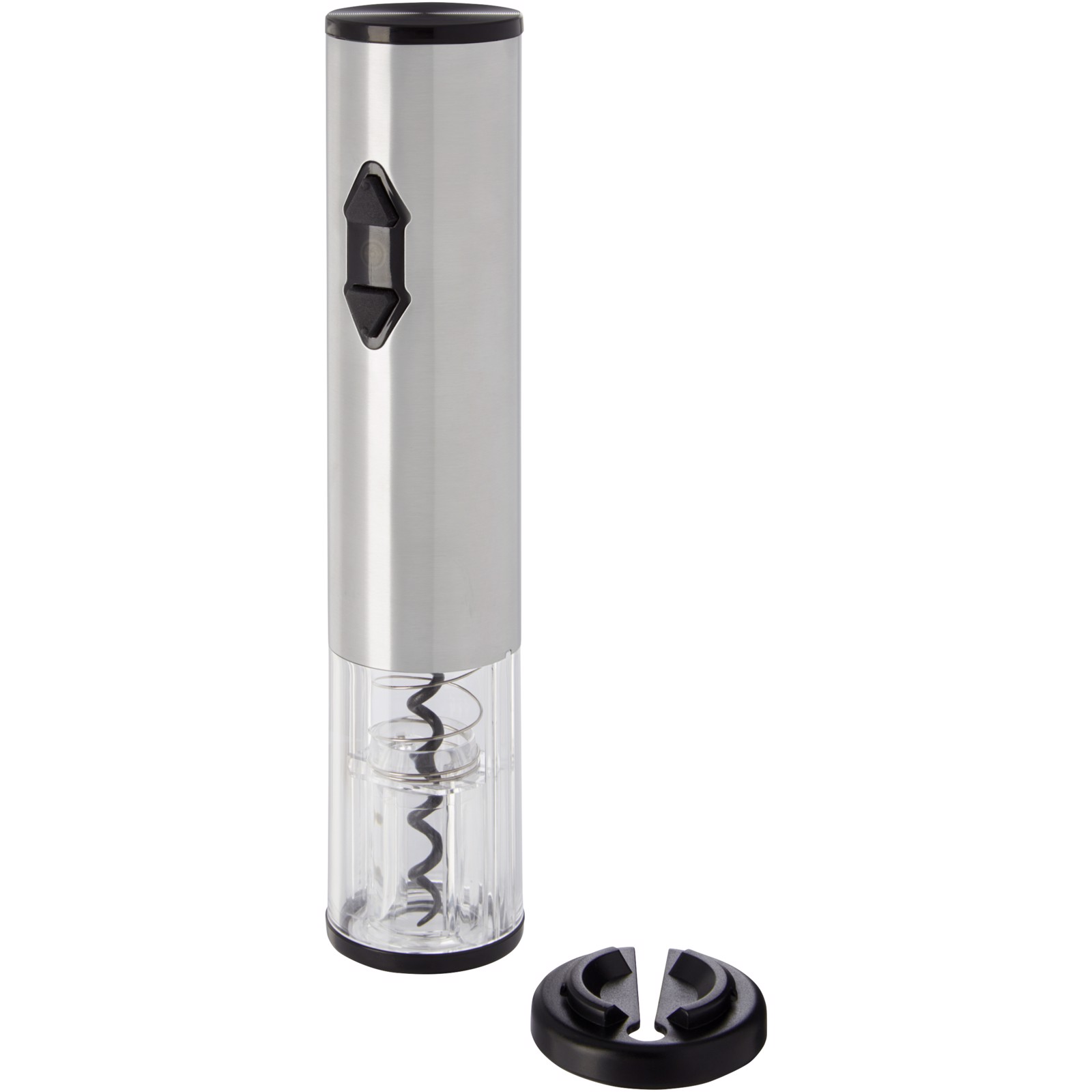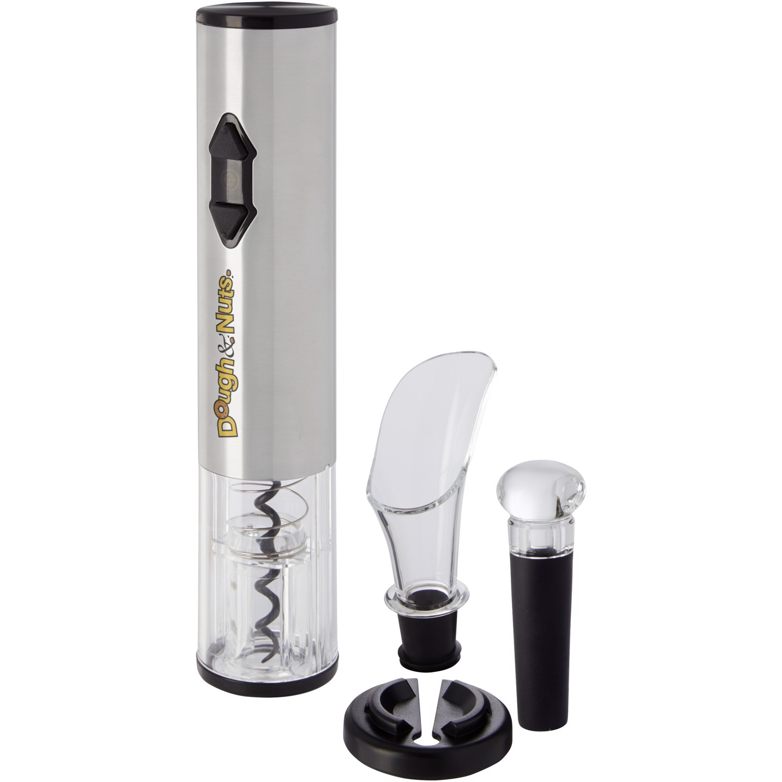 Elektrisk proptrækker kombineret med en folieskærer, en hælder og en prop. Den bruger fire AA-batterier (medfølger ikke).