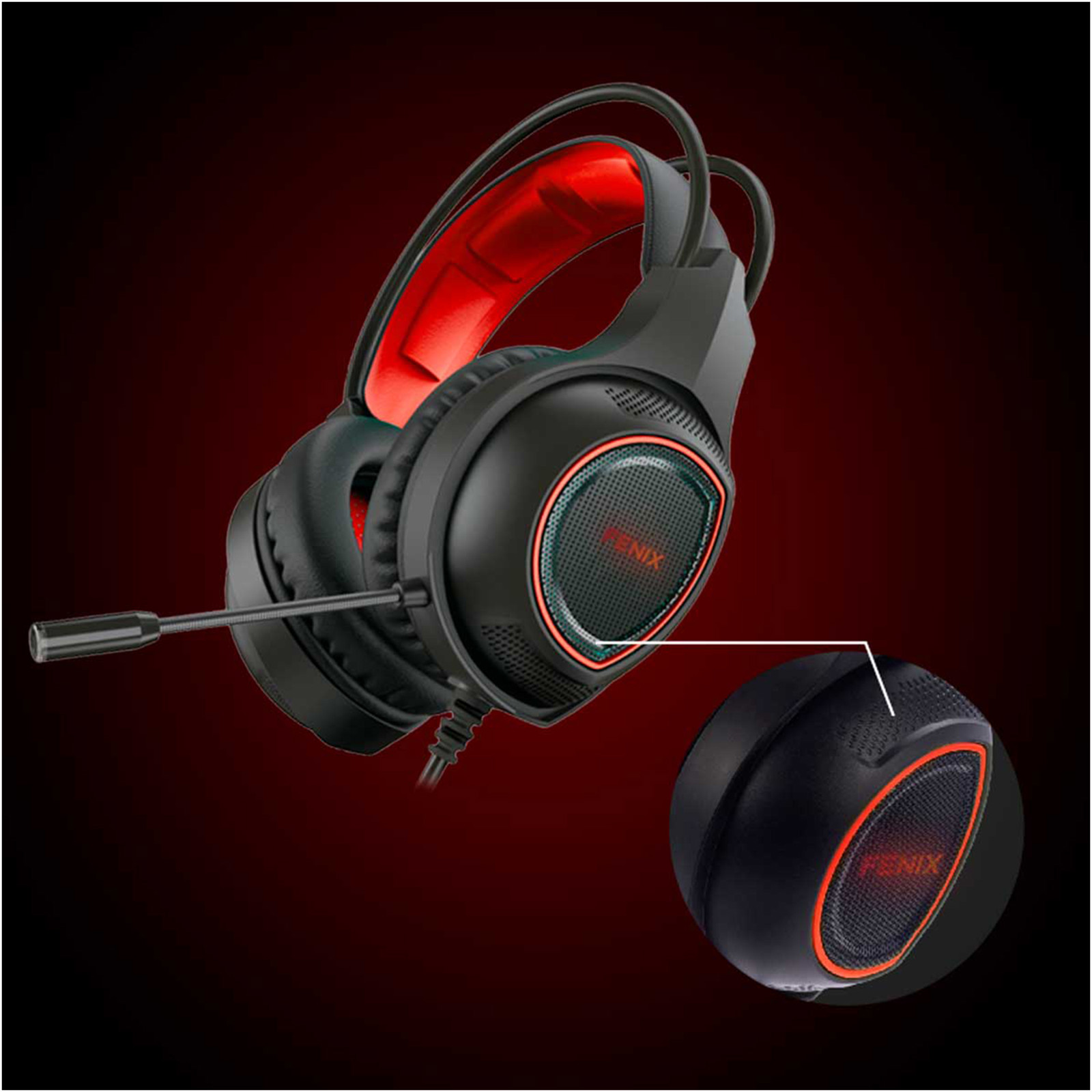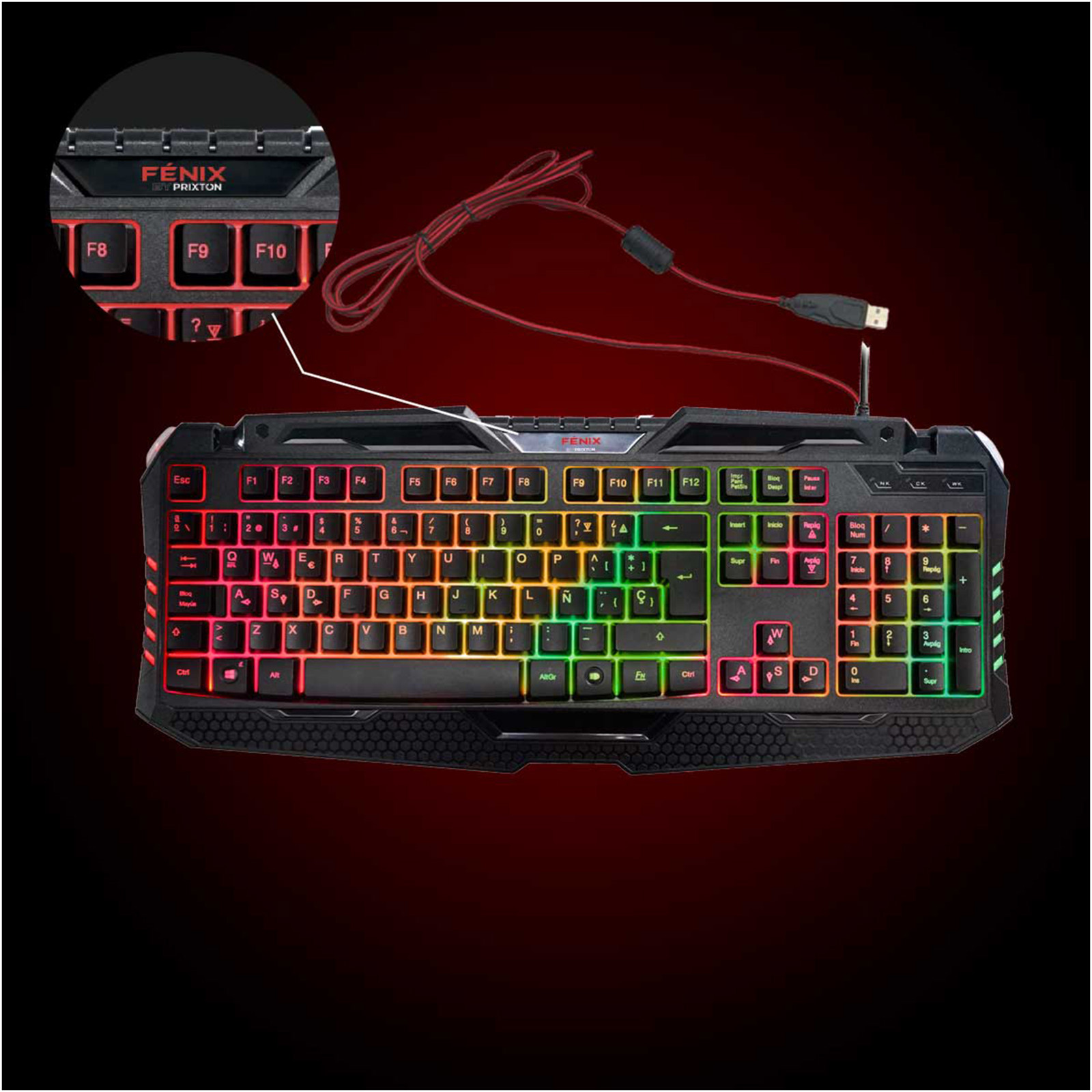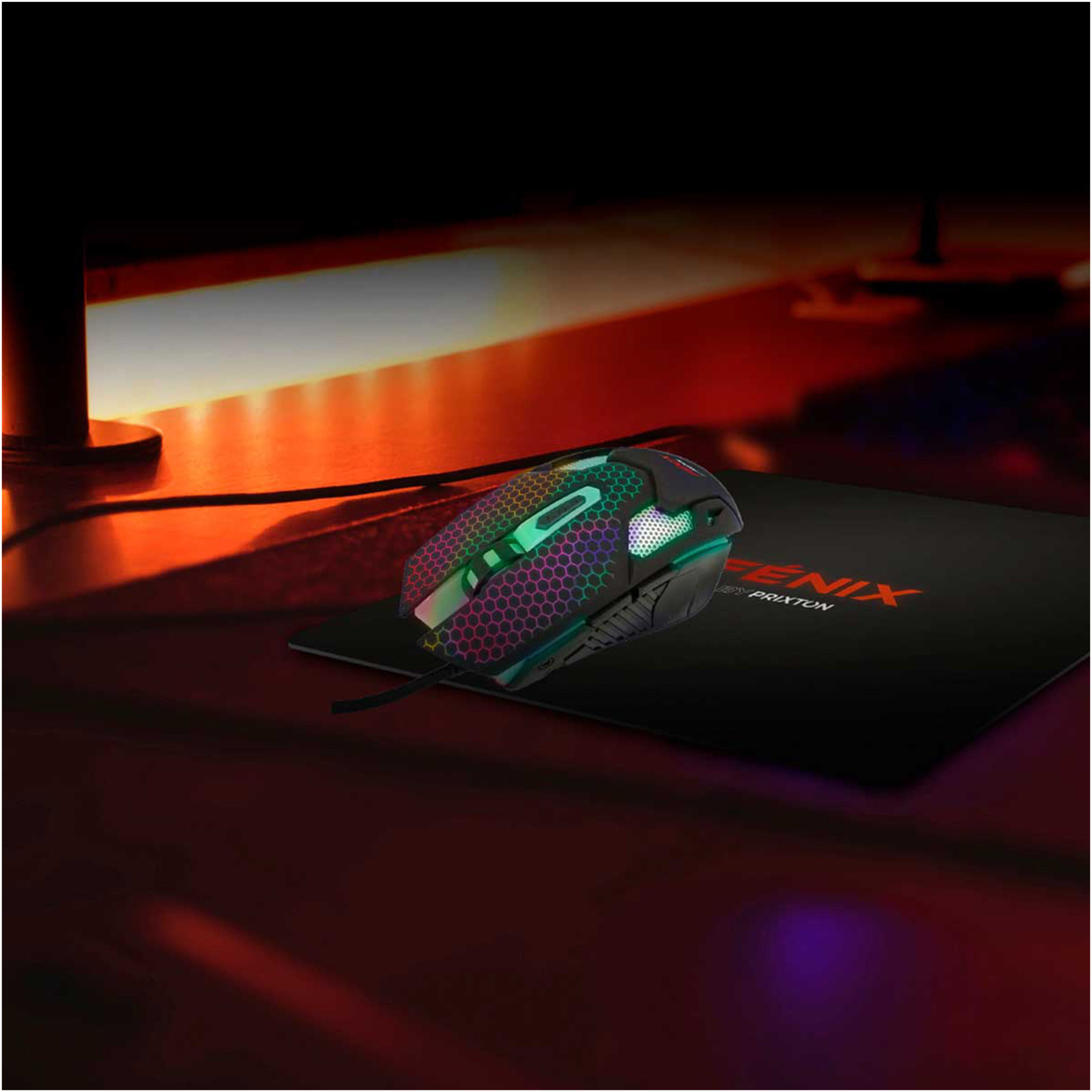 Gamerkit med tastatur, mus, headset og musemåtte. QWERTY-tastaturet har 105 taster og 3 integrerede baggrundslys. Musen har 6 knapper og 7 farver med opløsning 800/1200/1600/2400 dpi. Headset med rødt LED-baglys, 40 mm højttaler og adapter til pc, PS4 og XBOX.