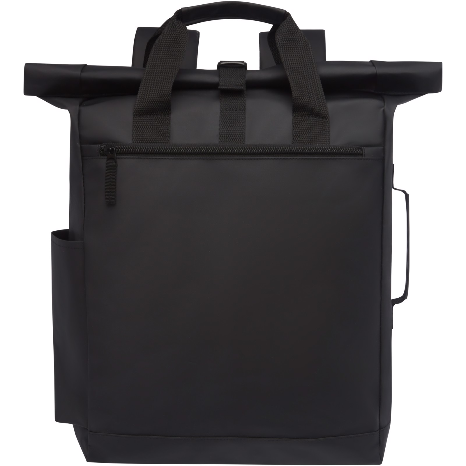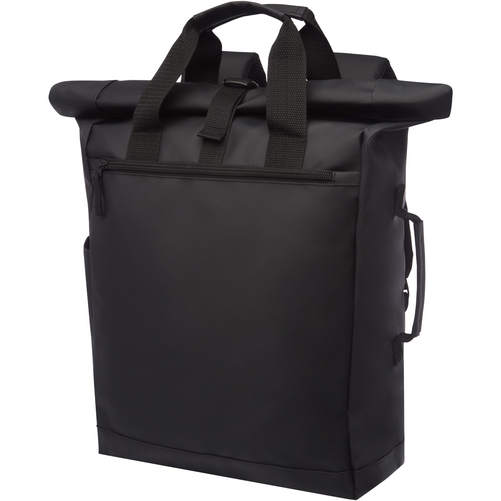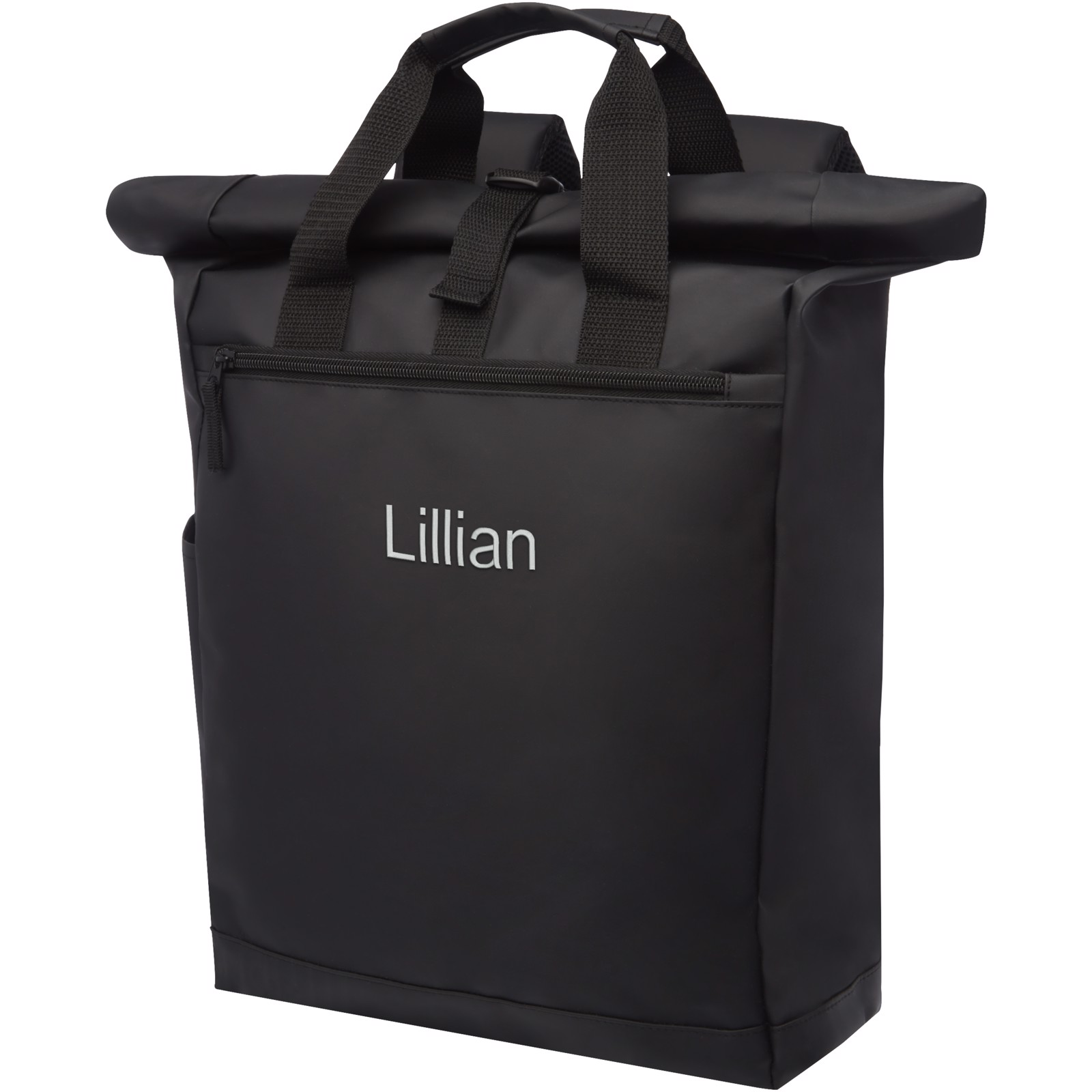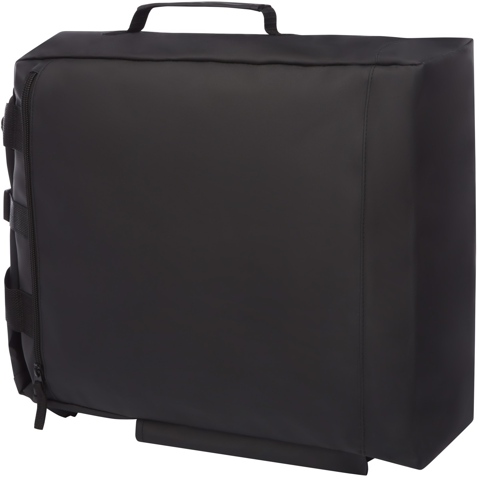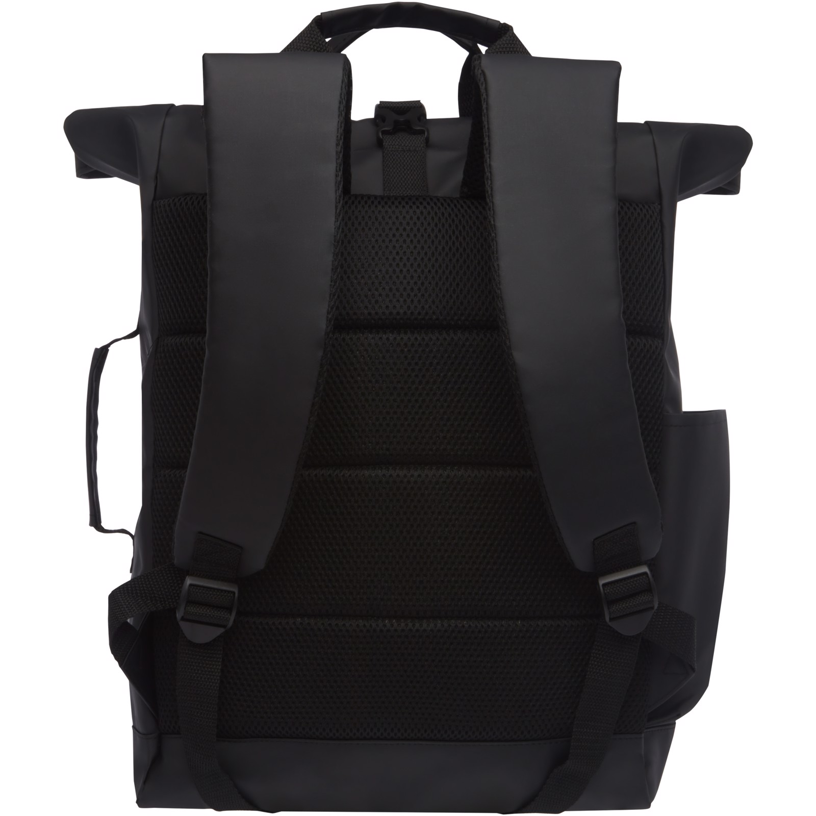 Vandafvisende rygsæk med polstret rum til bærbar, polstrede justerbare skulderstropper, hovedrum med lynlås og rullelukning foroven og to bærehåndtag.
