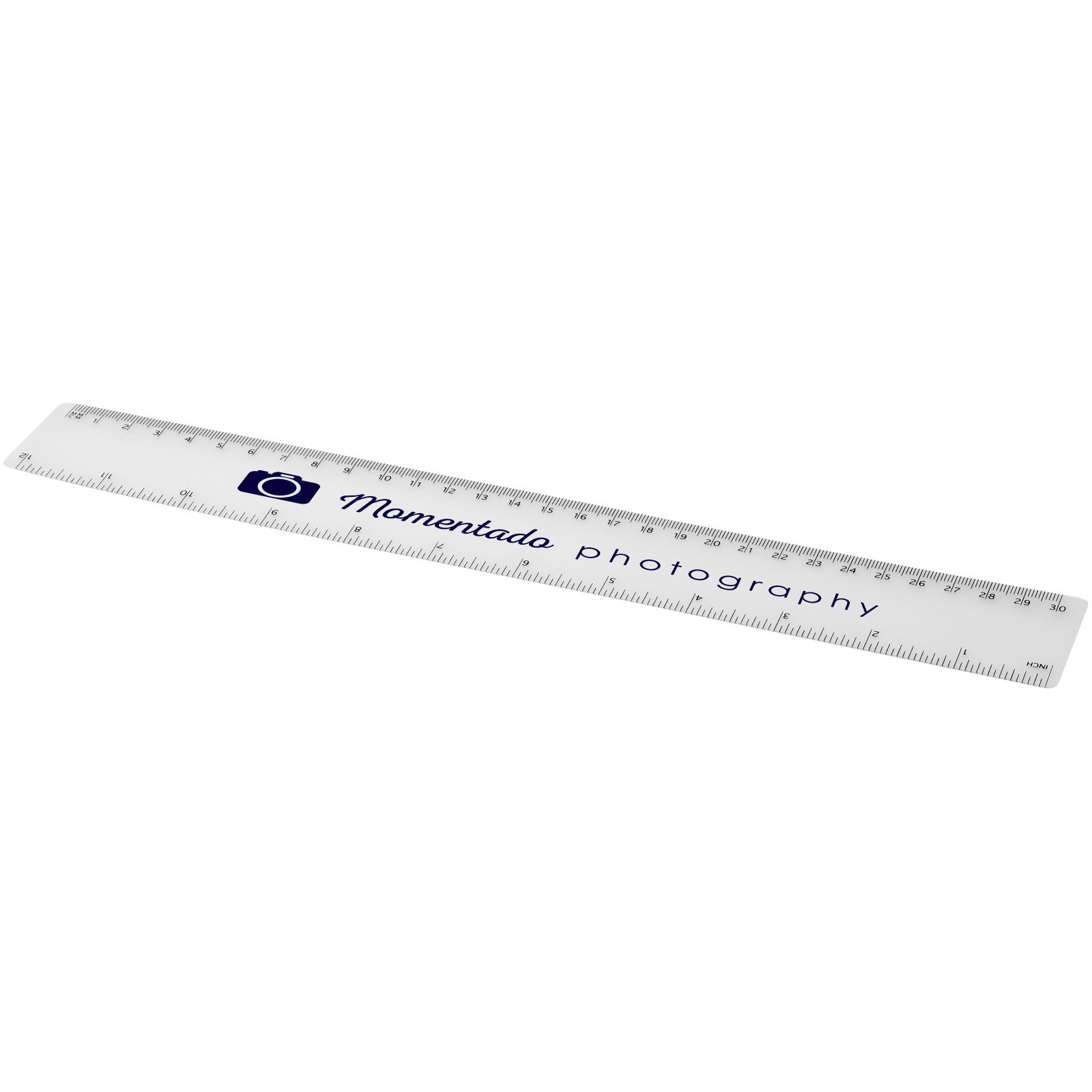Fleksibel letvægts plastiklineal med både tomme- og centimetermål. Bemærk at linealmarkeringerne bliver trykt samtidig med dit logo, så ved bestilling uden logo er der ingen linealmarkeringer.