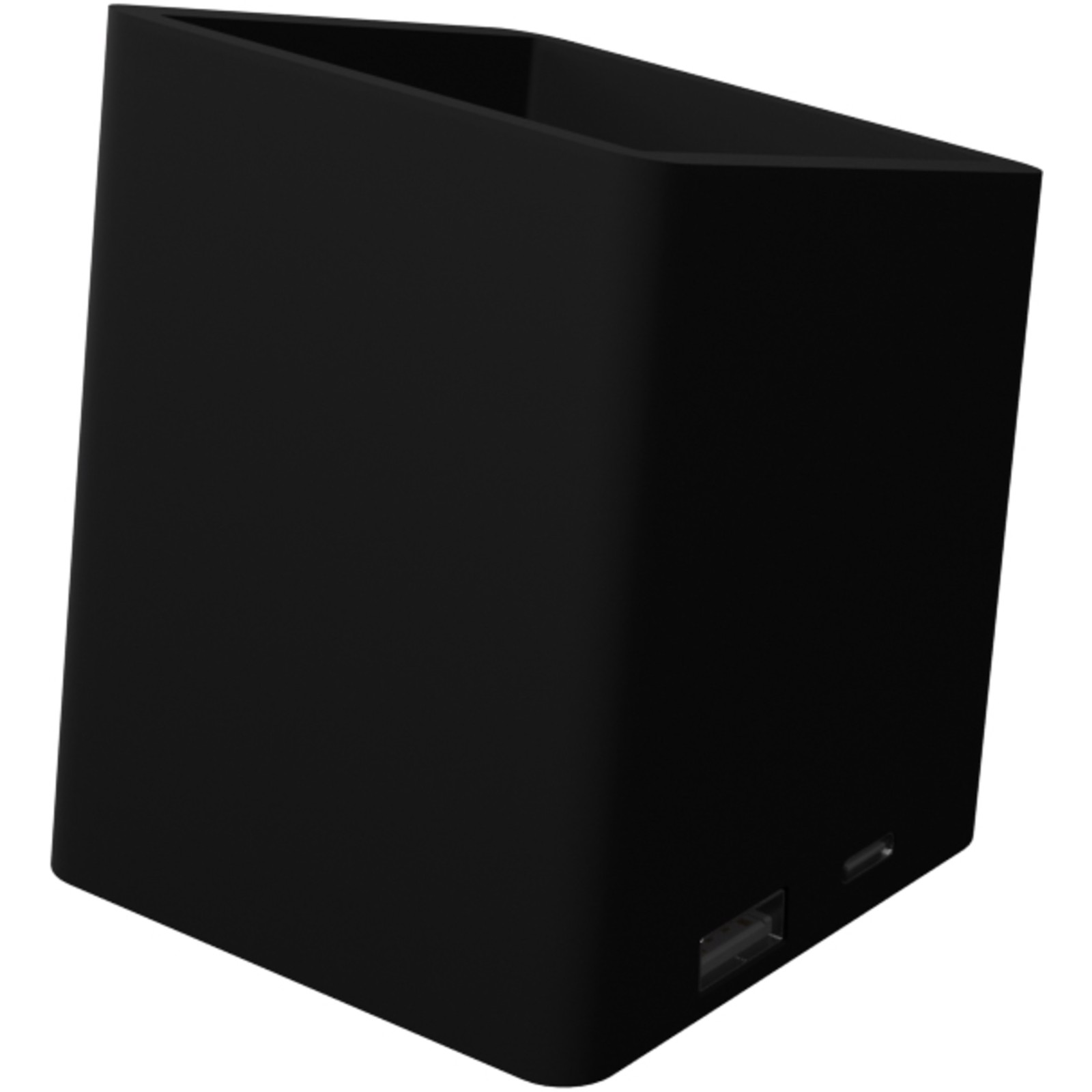 Penalhus (7,2 x 7,2 x 9 cm) med antibakteriel behandling og 2 USB-udgange: USB 1.0 og USB type C 1.0A. Det lysende logo sidder på forsiden og lyser, når det er tilsluttet. Leveres med et opladningskabel fremstillet af genvundet PET. Penalhuset er pakket i en sort gaveæske (11 x 7,7 x 8,6 cm) med magnetisk lukning. Inkluderer 3 års garanti.