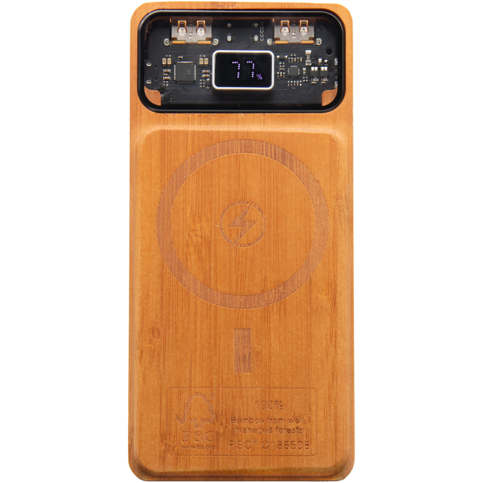 10.000 mAh powerbank lavet af 65 % træ, med oplyst logo og MagSafe teknologi, som gør det muligt at magnetisk fastgøre powerbanken bag på din iPhone (12 og nyere). Powerbanken har digitalt display og USB Type-C udgang/indgang, og leveres med et 3-i-1 rPET kabel (5V/2A) med 3 stik (Type-C, Micro USB, iPhone). Hvis din telefon ikke understøtter MagSafe teknologien, men understøtter trådløs opladning, kan du sætte det medfølgende metalringklistermærke på bagsiden af telefonen for at gøre det kompatibelt med den magnetiske holder. Leveres i en æske af genbrugspapir (18,6 x 10 x 2,6 cm).
