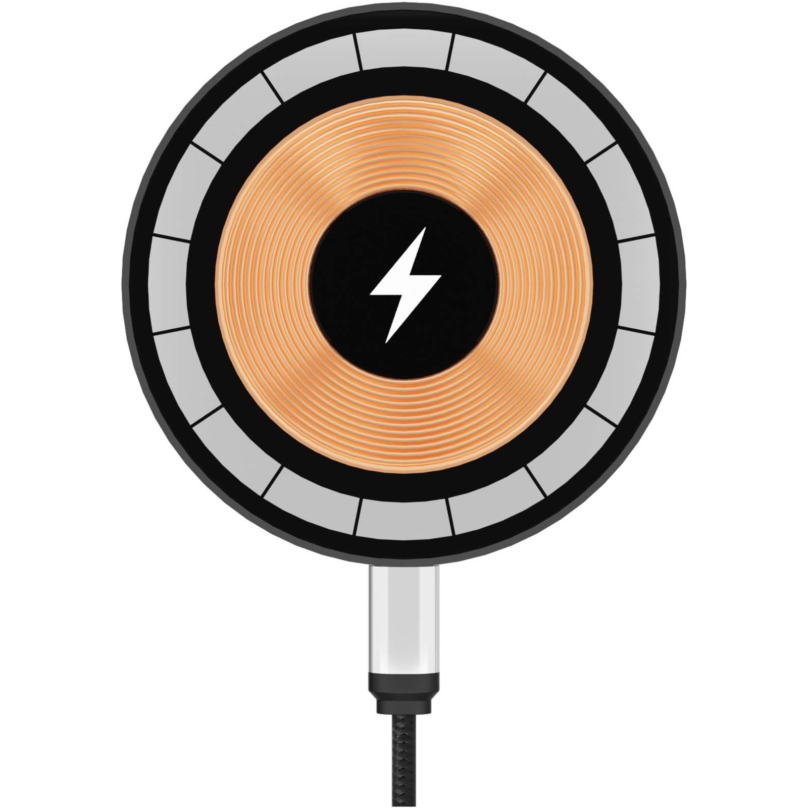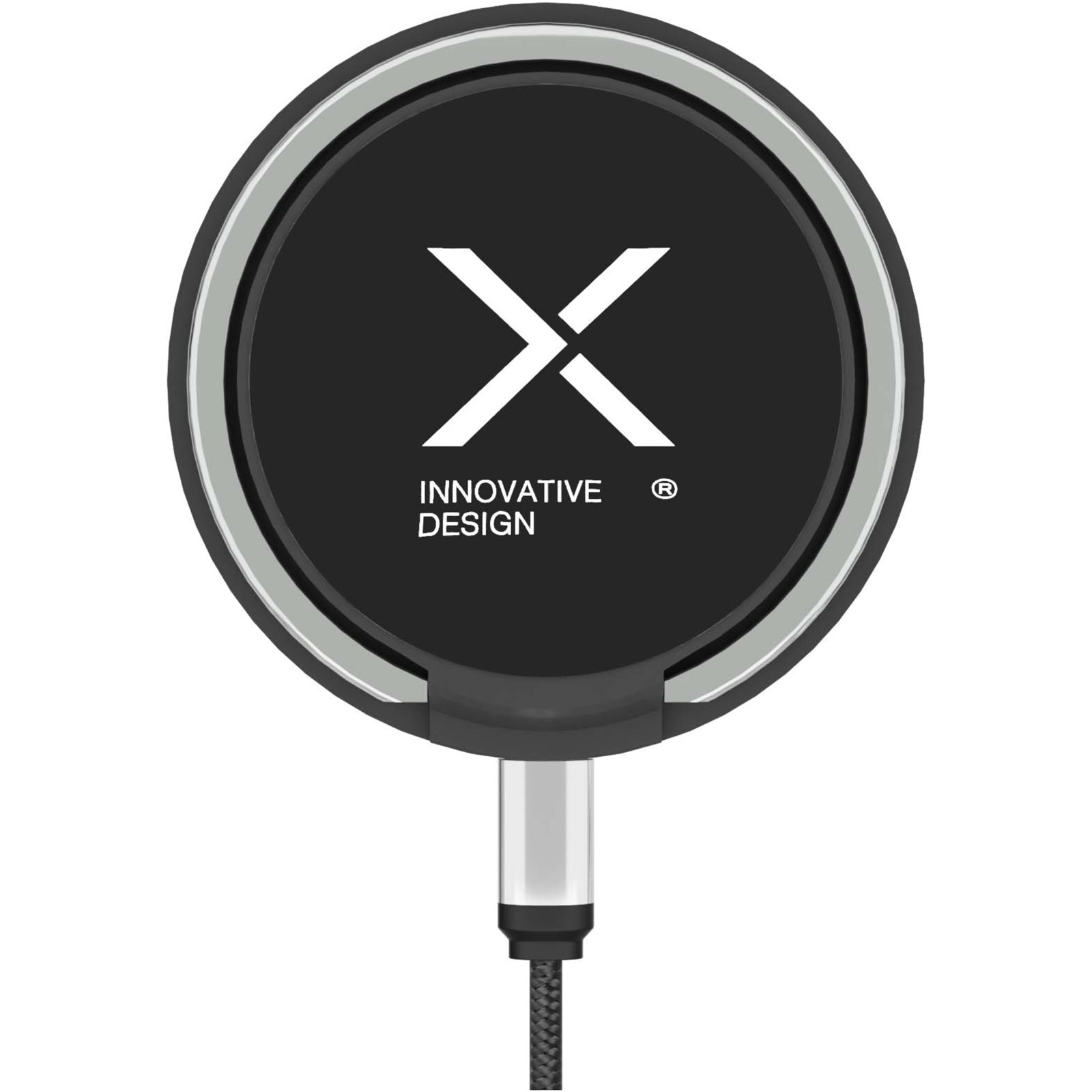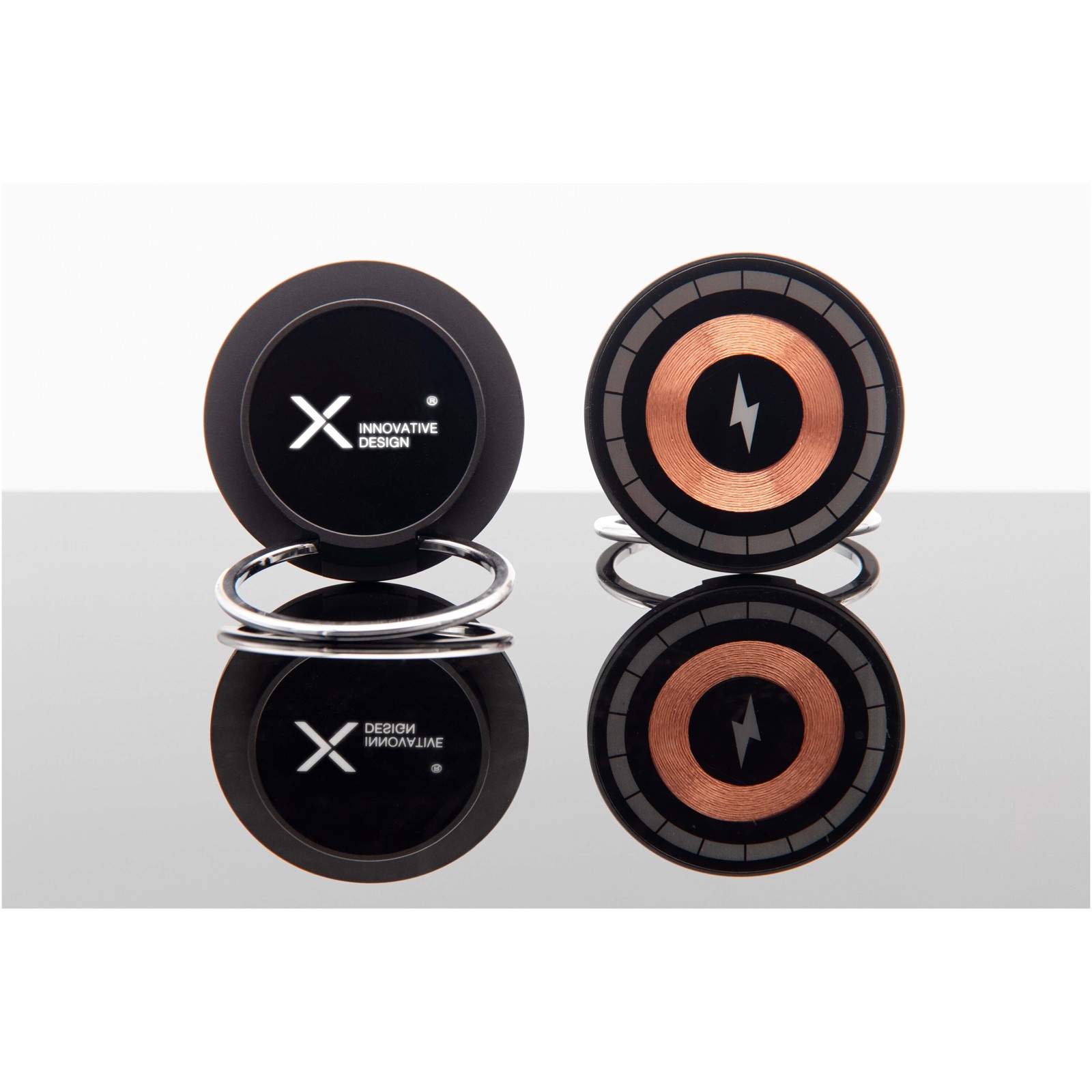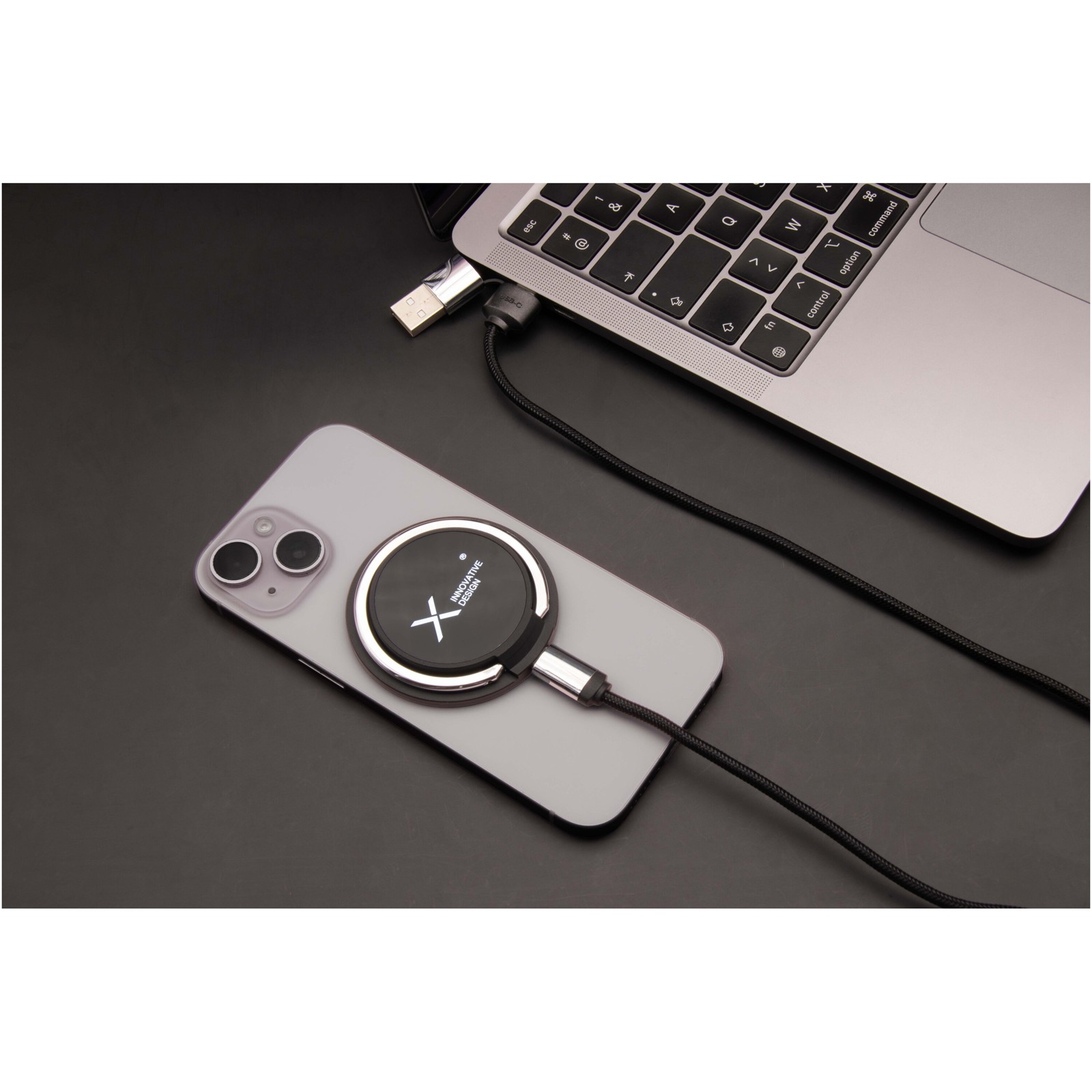 15 W trådløs opladningsplade fremstillet af genanvendt aluminium. Med den foldbare ring kan en enhed oplades i både lodret og vandret position. 2-i-1 rPET kabel fremstillet af genbrugsplast fra flasker er inkluderet. Leveres i en æske af genbrugspap.