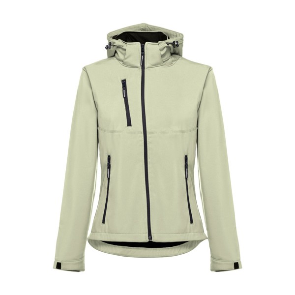 Softshellvest til kvinder i 96% polyester og 4% elastan (280 g/m²²) med to lag, aftagelig hætte og vandtæt belægning. Foret jakke med 2 lommer foran og diagonal brystlomme, alle med lynlås. Justerbare manchetter med justerbartbånd. Aftagelig hætte med snor og bånd til fastgørelse på kraven. Afrundet kant på ryggen. Størrelser: S, M, L, XL, XXL
