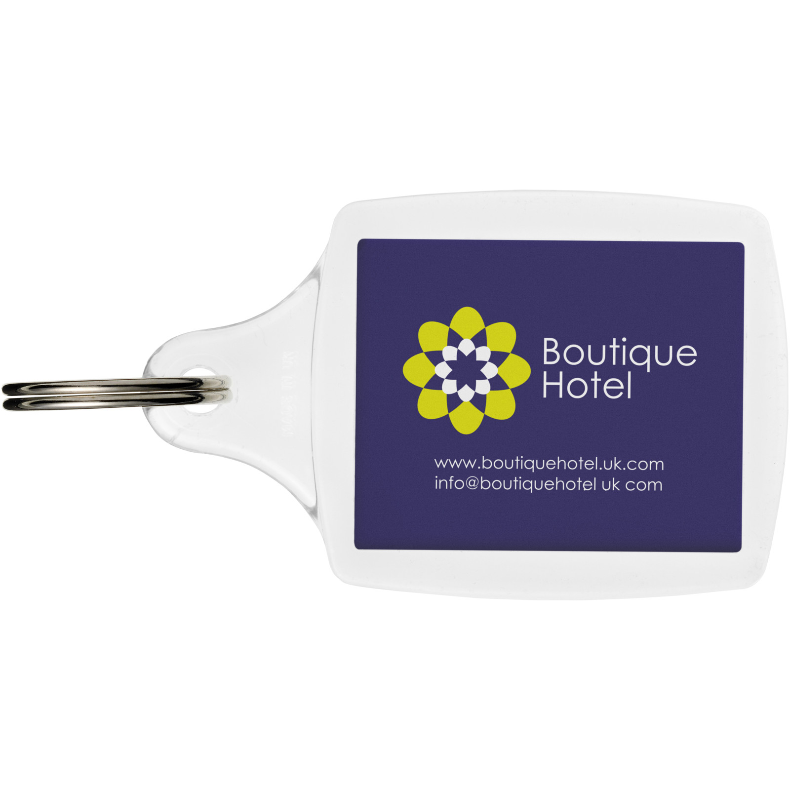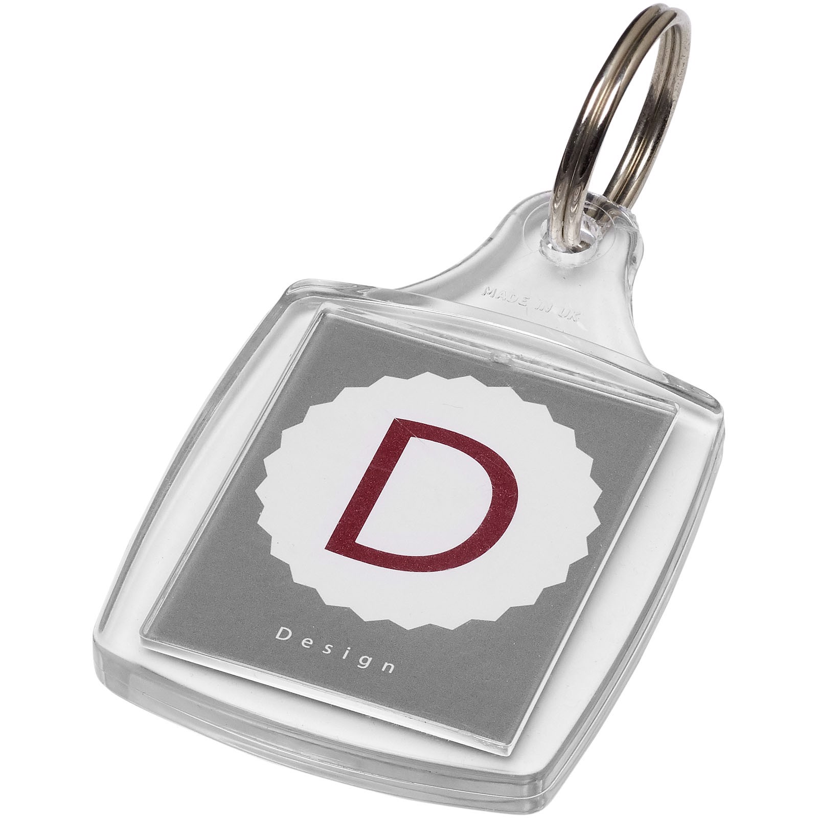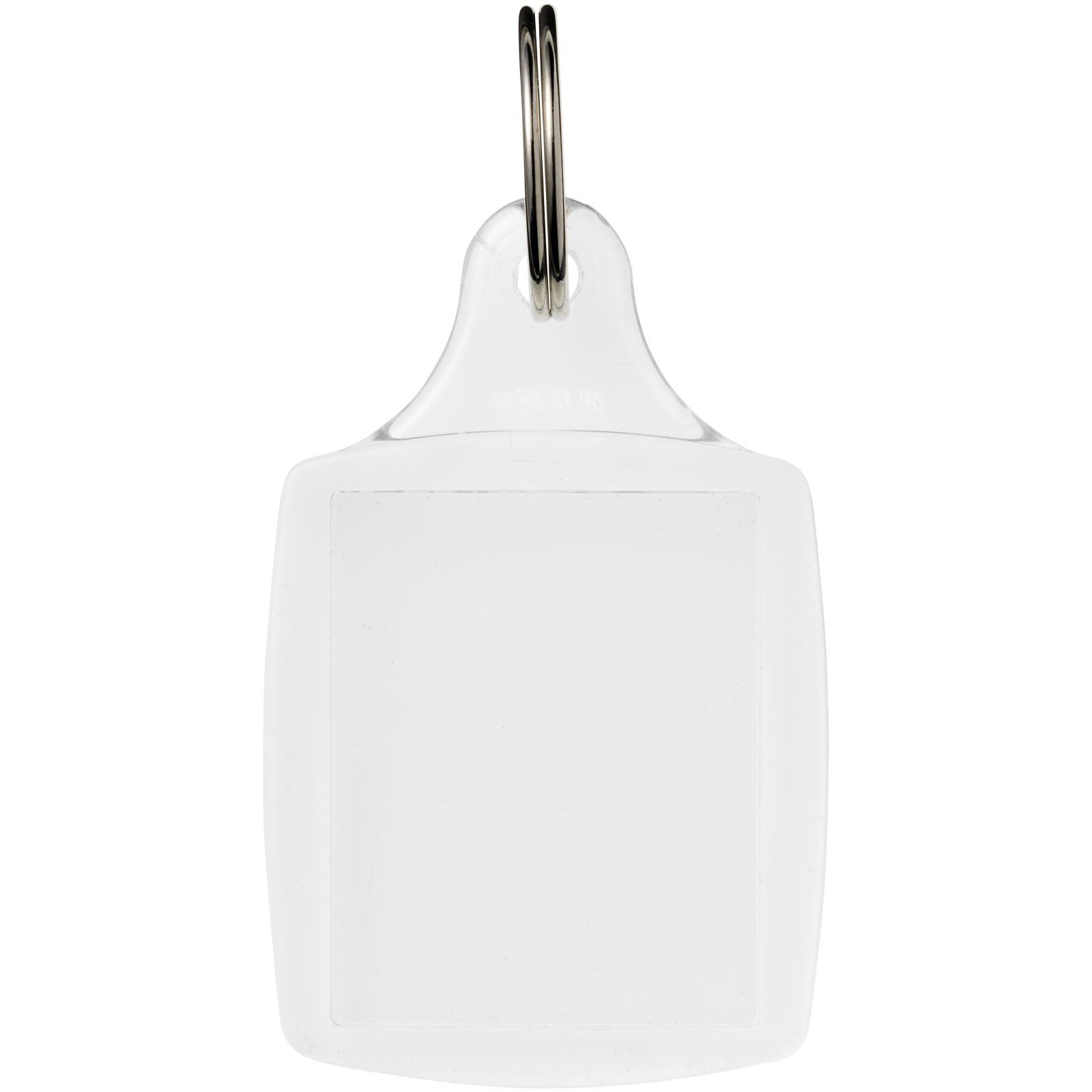 Klar A5 nøglering med en metal split nøglering. Designet til et papirindlæg eller et pasfoto. Udskriv indlagte dimensioner: 4,5 cm x 3,5 cm.