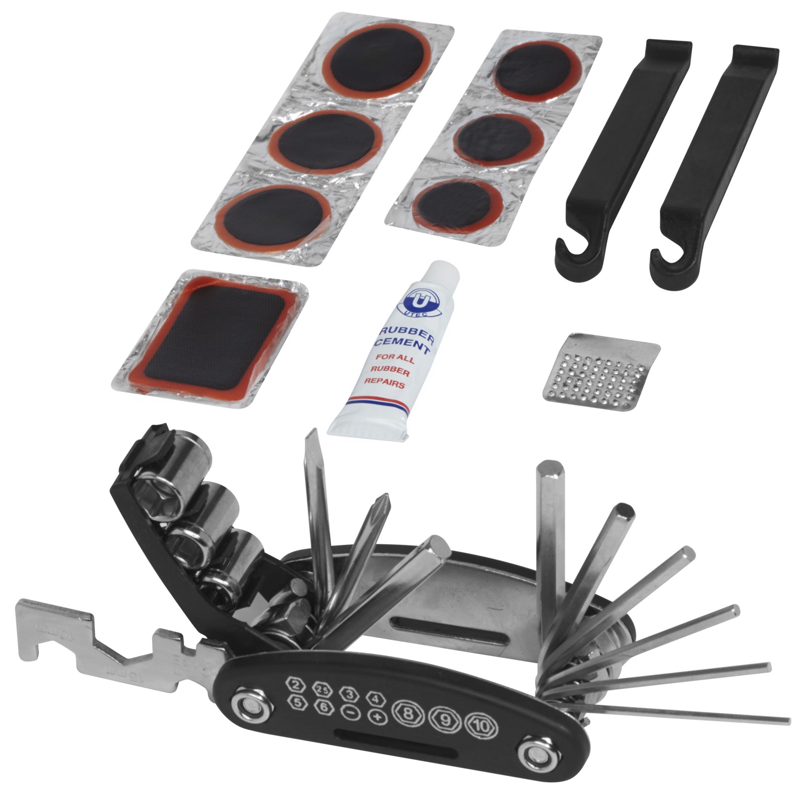 Multiværktøj med 15 dele, 2 dækjern, rivejern, lim, lapper samt taske med refleksbånd og 2 stropper med burrebånd lukning, så den kan hænges på cyklen.